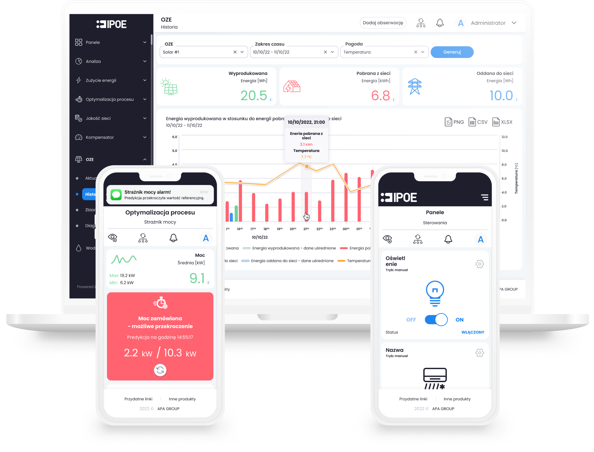 Inteligentna Platforma Optymalizacji Energii (IPOE/NPOE) pozwala w jednym miejscu monitorować zużycie energii elektrycznej, gazu, wody, ciepła i powietrza – dając Ci pełny obraz tego, co naprawdę dzieje się w Twojej firmie. Z IPOE możesz tkże zarządzać instalacjami PV i wiatrowymi, monitorować OZE, zabezpieczać funkcjonowanie wielu stacji ładowania aut elektrycznych.